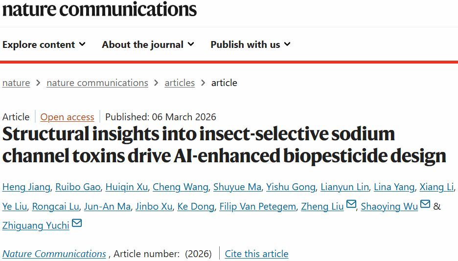 热带作物安全生产关键技术研发与应用吴少英团队在Nature Communications发表研究论文《Structural insights into insect-selective sodium channel toxins drive AI-enhanced biopesticide design》。该研究系统揭示了天然动物源杀虫多肽调控昆虫钠离子通道的分子机制及其物种选择性的分子基础,并结合人工智能方法实现多肽分子的理性优化设计,为新一代高效、绿色生物农药的创制提供了重要理论依据和技术支撑。
